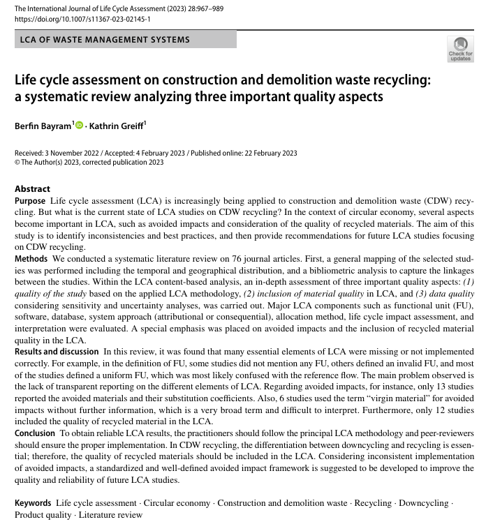 原文标题:Life cycle assessment on construction and demolition waste recycling: a systematic review analyzing three important quality aspects