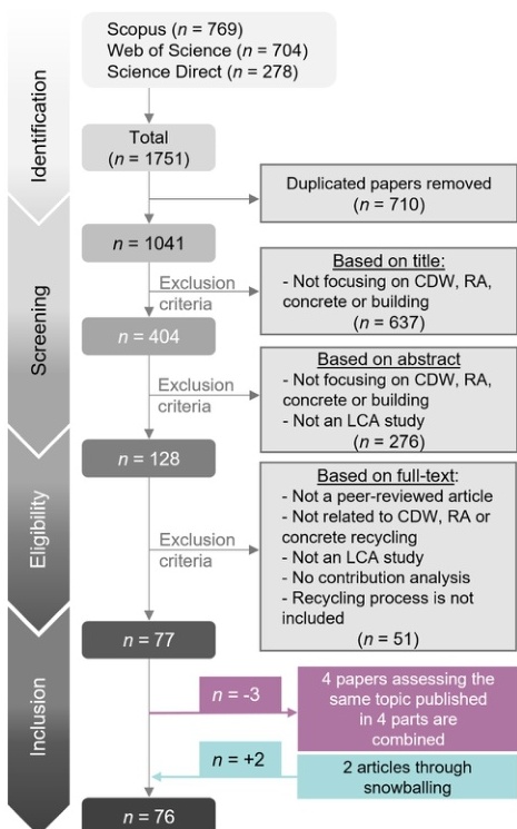 研究团队采用PRISMA系统综述方法,从Scopus、Web of Science及Science Direct三大数据库中筛选出1041篇初步文献,经过标题/摘要筛选、全文审查及雪球抽样,最终纳入76篇高质量研究。分析框架分为两个层次:科学计量分析(时空分布、文献引用网络、关键词共现)与LCA内容深度解析。后者聚焦于五个关键研究问题,涵盖功能单元定义、材料质量纳入、系统方法选择、避免影响计算及敏感性/不确定性分析。值得注意的是,研究并未简单套用ISO 14040/44标准进行符合性检查,而是试图揭示标准在CDW回收这一特定场景下的适用性边界。