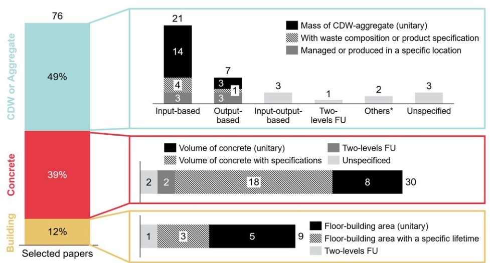方法论缺陷的多层次剖析揭示了令人担忧的现状。在功能单元(FU)定义中,超过5篇研究根本未提及FU,而大多数研究定义了”统一功能单元”(如1吨CDW或1吨再生骨料),但实际上混淆了功能单元与参考流的概念——前者应描述服务性能(如承载能力、使用寿命),后者才是物理量。这一混淆导致不同研究间无法进行有意义的比较。例如,针对再生骨料混凝土(RAC)的研究中,仅有部分研究将抗压强度纳入FU(如1 m³ 30MPa混凝土),其余研究直接以体积为单位,忽视了再生骨料替代率增加会导致强度下降这一客观事实,从而造成环境影响评估的失真。