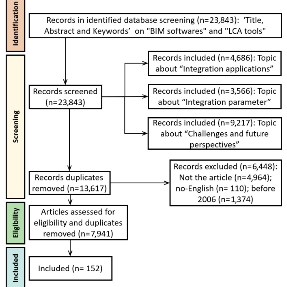 研究采用PRISMA系统综述方法,从Web of Science检索23,843篇相关文献,经主题筛选、类型过滤(仅保留2006-2023年英文期刊论文)及VOSviewer关键词共现分析,最终锁定152篇核心文献。分析框架围绕三大维度展开:软件生态评估(BIM软件、LCA工具、能耗计算工具的能力与局限)、集成方法分类(数据交换技术及自动化程度)、影响因素解析(LOD水平、互操作性、认证体系)。值得注意的是,研究并未仅停留在技术工具的罗列,而是通过批判性视角揭示了不同集成路径在效率、精度、可扩展性上的权衡关系,为实践者提供了决策依据而非简单的”最佳实践”推荐。