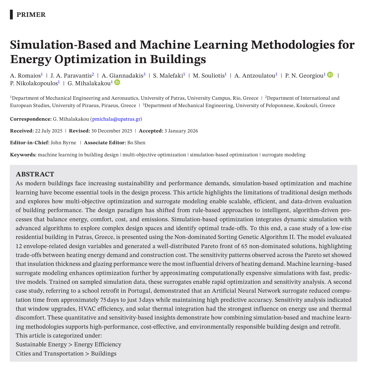 这篇综述型方法论文指出,面向低碳与高性能目标的建筑设计已经难以依赖经验与试错式调参来完成“多目标平衡”,因为能耗、舒适、成本与排放之间存在天然张力。作者以“模拟驱动的多目标优化(SBO)+ 机器学习代理模型(surrogate)”为主线,梳理了优化算法如何与动态模拟耦合、如何通过帕累托解集呈现可解释的权衡边界,并用两个案例展示其工程可行性:其一是希腊Patras的低层住宅围护结构优化(NSGA-II、12个设计变量、65个非支配解),其二是葡萄牙Coimbra学校节能改造中用ANN代理将TRNSYS求解时间从约75天缩短到约3天,同时维持较高预测精度。文章强调,代理模型并非替代物理,而是以可验证的方式把昂贵的模拟计算“压缩”为可快速迭代的决策支持。