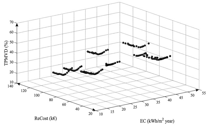 第一组案例(希腊Patras住宅)用于说明SBO在围护结构早期决策中的可操作性:NSGA-II在12个围护相关变量上进行搜索,输出65个非支配解,清晰呈现了采暖能耗与材料成本的对抗关系。更重要的是,作者强调“解集之后还需要解释”,因此引入了对帕累托集合的敏感性观察:保温厚度与玻璃性能在能耗驱动中最关键,这种结论能够把优化的“黑箱输出”转化为设计优先级。