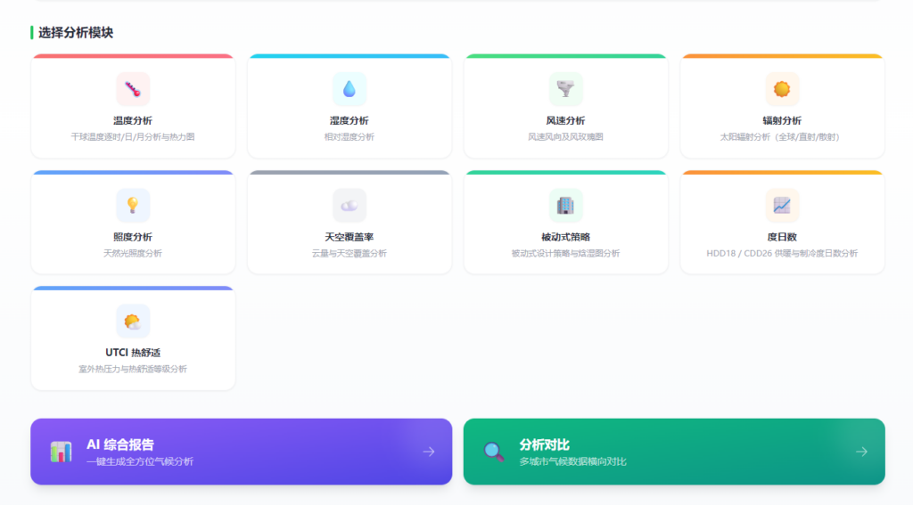 绿建小筑的常驻工具——LBT Climate Tools 气象数据可视化平台完成了一次较大幅度的功能迭代。本次更新新增了度日数(Degree Days)与通用热气候指数(UTCI)两个分析模块,上传 EPW 文件后即可直接查看供暖制冷度日数分布以及室外热舒适评估结果。AI 气候分析功能经过重构,采用”先计算、后解读”的工作模式:系统在调用 AI 之前会先生成定量统计摘要,AI 基于这些真实数据进行解释并给出设计建议,而不再是脱离上下文的泛泛而谈。风玫瑰图的生成兼容性问题已修复,综合报告模块也正式上线——它能够汇总温度、湿度、风、辐射等多个气候维度的统计结果,一键生成完整的气候分析报告。欢迎大家体验新功能,使用中如遇问题随时反馈。