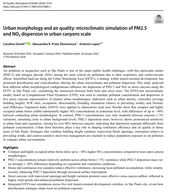 如果说第一篇关注的是”热”如何穿透建筑围护结构,这篇则关注”风”如何在建筑缝隙间搬运污染物。研究选取巴西圣保罗市五条公交导向开发(TOD)走廊中形态各异的街道峡谷,利用 ENVI-met 的 CFD 模块模拟 PM2.5 与 NO₂ 在行人高度处的浓度分布与沉降质量。为刻画城市形态特征,研究构建了一套包含城市密度指数、垂直度、高宽比(H/W)、占地率、风向指向性及 NDVI 在内的多指标体系。结论揭示了一个值得深思的分化:紧凑高占地率的城市形态使行人层 NO₂ 浓度差异可达约 80%,但 PM2.5 浓度在不同峡谷间的变化却不到 5%——真正对城市形态敏感的是 PM2.5 的沉降质量,差异超过 60%。换言之,浓度指标与沉降指标讲述的是截然不同的故事,仅凭其中一个维度做设计判断会遗漏关键信息。此外,密集行道树虽能增强颗粒物的拦截沉降,却同时削弱了有效通风,造成局部污染物累积——这一”双刃剑”效应对”多种树就能改善空气质量”的简单化叙事构成了直接挑战。